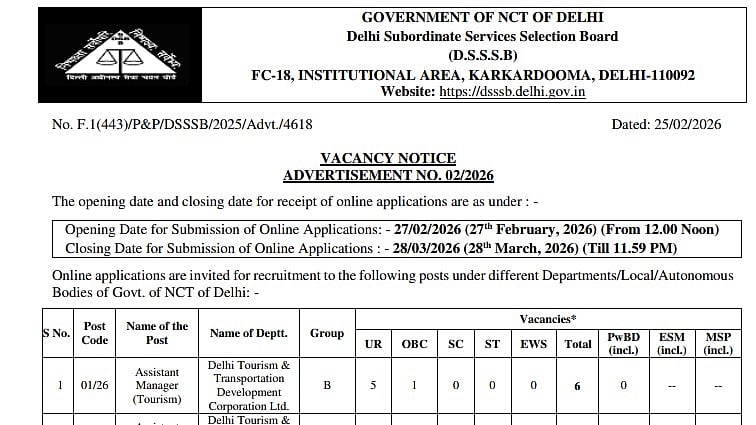 DSSSB Recruitment 2026: The Delhi Subordinate Services Selection Board (DSSSB) is set to close the application window for its ongoing recruitment drive under Advertisement No. 02/2026 on March 28, 2026 at 11:59 PM. The board is inviting applications for a wide range of posts across departments of the Government of NCT of Delhi, with a total of 216 vacancies on offer.