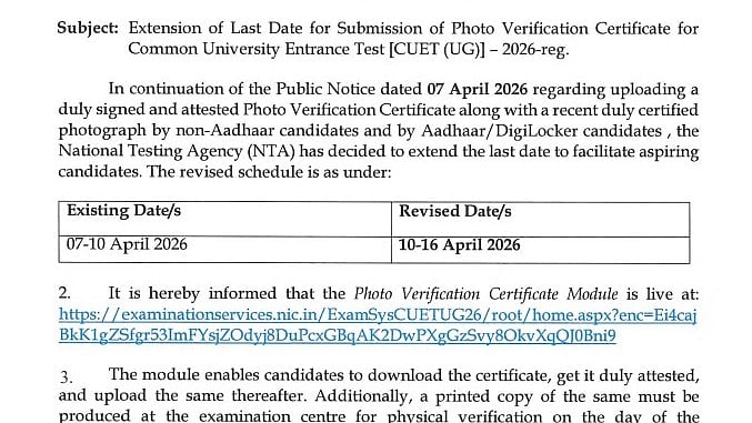 The National Testing Agency (NTA) will close the CUET UG 2026 Photo Verification Window today via its official website, cuet.nta.nic.in. Candidates who have not yet completed the process are encouraged to do so before the deadline.