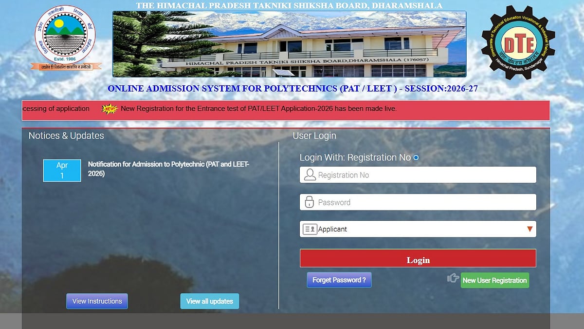 HP PAT 2026 Registration: The Himachal Pradesh Board of Technical Education (HPBTE) has started the HP PAT 2026 Registration Process on its official website. Eligible candidates seeking admission to diploma programs in engineering and non-engineering streams can apply online through the official website hptechboard.com till May 5, 2026. The Admit Card will be released on 11th May 2026.