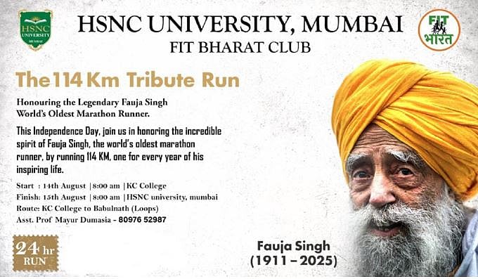 In a moving celebration of endurance, resilience and the indomitable human spirit, HSNC University’s Fit Bharat Club successfully organised the 114 Km Tribute Run on the eve of India’s 79th Independence Day, honouring the legendary Fauja Singh (1911–2025), the world’s oldest marathon runner.