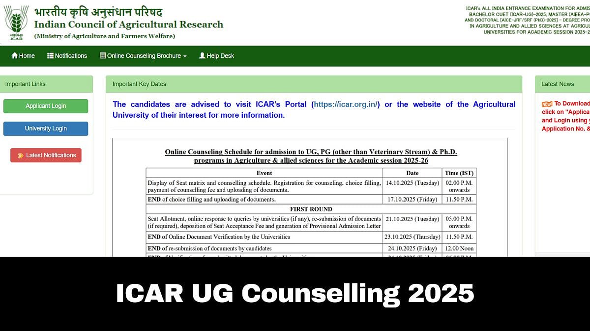 ICAR UG Counselling 2025: The Indian Council of Agricultural Research (ICAR) will start online registration for ICAR Undergraduate (UG) Counselling 2025 at 2 p.m. today, October 14, 2025. Those who have passed the Common University Entrance Test - Undergraduate (CUET UG 2025) can submit applications for admission to UG programs in agriculture and allied subjects through the official counselling site at icarcounseling.com.
