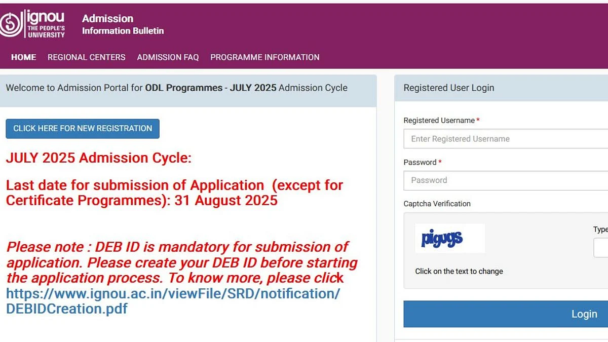 Indira Gandhi National Open University (IGNOU) has extended the last date for registration of its Open and Distance Learning (ODL) programmes up to August 31, 2025. It is an opportunity offered for students who are yet to finish applying on the official website at ignouadmission.samarth.edu.in.