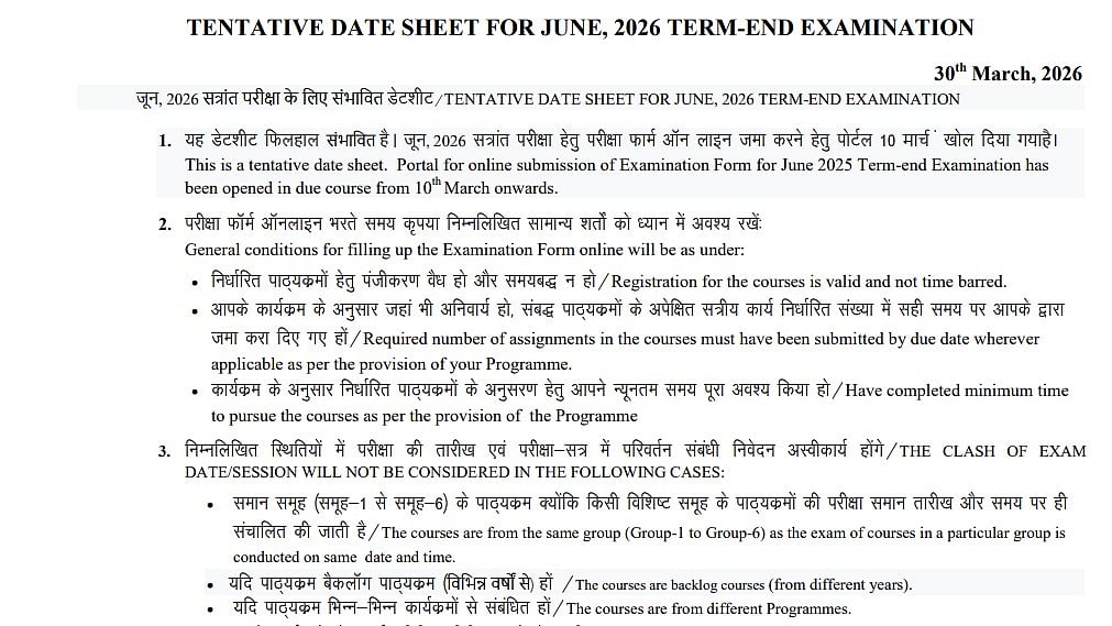 IGNOU Datesheet 2026: The Indira Gandhi National Open University (IGNOU) has released the tentative date sheet for the June 2026 Term-End Examination (TEE) today on the official website. Candidates planning to appear for the upcoming exams are advised to check the schedule carefully and complete all required formalities within the given deadlines. Students can report discrepancies (if any) in the date sheet via email to datesheet@ignou.ac.in within the specified deadline.