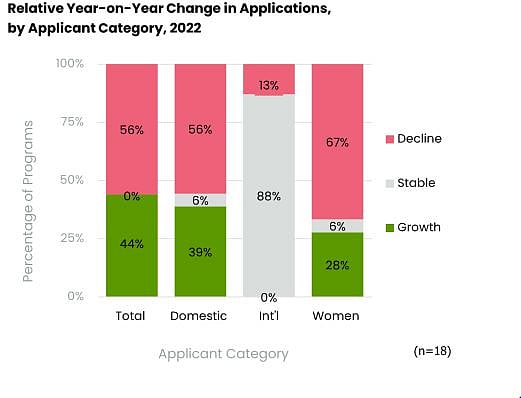 Overall, 2022 was not entirely a good year for Indian B schools as compared to 2021, when 69 percent of programs reported total application growth compared with the year prior. In 2022, application volumes moderated as 56 percent of programs reported decline in total applications.
