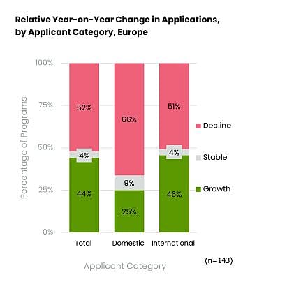 Canadian programs, on the other hand, saw significant drops in both domestic and international applications. Among Canadian programmes that responded to each of the last two years’ surveys, total applications were down 23 percent year-on-year, with 75 percent of programs reporting declines in domestic applications and 68 percent reporting declines in international applications. This reversal comes after years of consistently positive outcomes for Canadian schools dating back to 2017, coinciding with the reduction of visa availability in the US.
