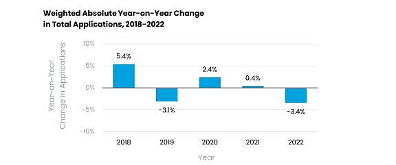 Among programs that responded to each of the last two years’ surveys, total applications were down 2.9 percent, driven chiefly by a 2.9 percent drop in domestic applications, which accounts for the vast majority of submitted applications (81%). Off an already small base of international applications in 2021, the volume also fell by about half in 2022 (54%), according to the study by GMAC.