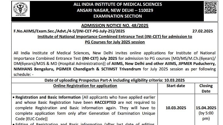 INI CET 2025 July Session: INI CET 2025 registration is now open online for the July session at the All India Institute of Medical Sciences (AIIMS). To gain admission to MD, MS, MDS, DM, and MCh programmes at 19 AIIMS, JIPMER Puducherry, PGI Chandigarh, SCTIMST Trivandrum, and NIMHANS, students who are willing to take the Institute of National Importance Combined Entrance Test (INI-CET) for the July 2025 session can apply online at aiimsexams.ac.in.