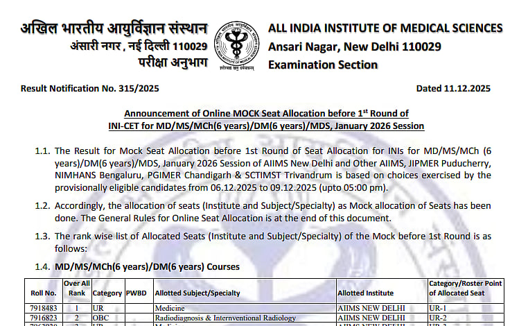 INI CET January 2026 Mock Seat Allotment Result: The INI CET mock round counseling results for the January 2026 session have been formally issued by the All India Institute of Medical Sciences (AIIMS), New Delhi. The INI CET 2026 counseling seat allotment result PDF is now available on the official website for students who took part in the mock round counseling process for MD, MS, MCh, DM, and MDS courses at AIIMS and other participating institutions. You can access the allocation result for the mock round at aiimsexams.ac.in.
