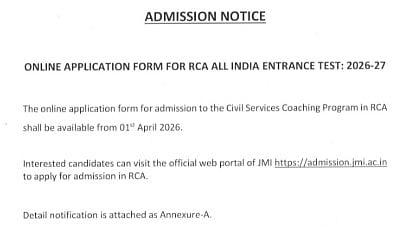 JMI RCA Civil Services 2026: Jamia Millia Islamia has released a notification stating that the online applications for the Civil Services Coaching Program in the Residential Coaching Academy (RCA) program will be available from April 1, 2026.