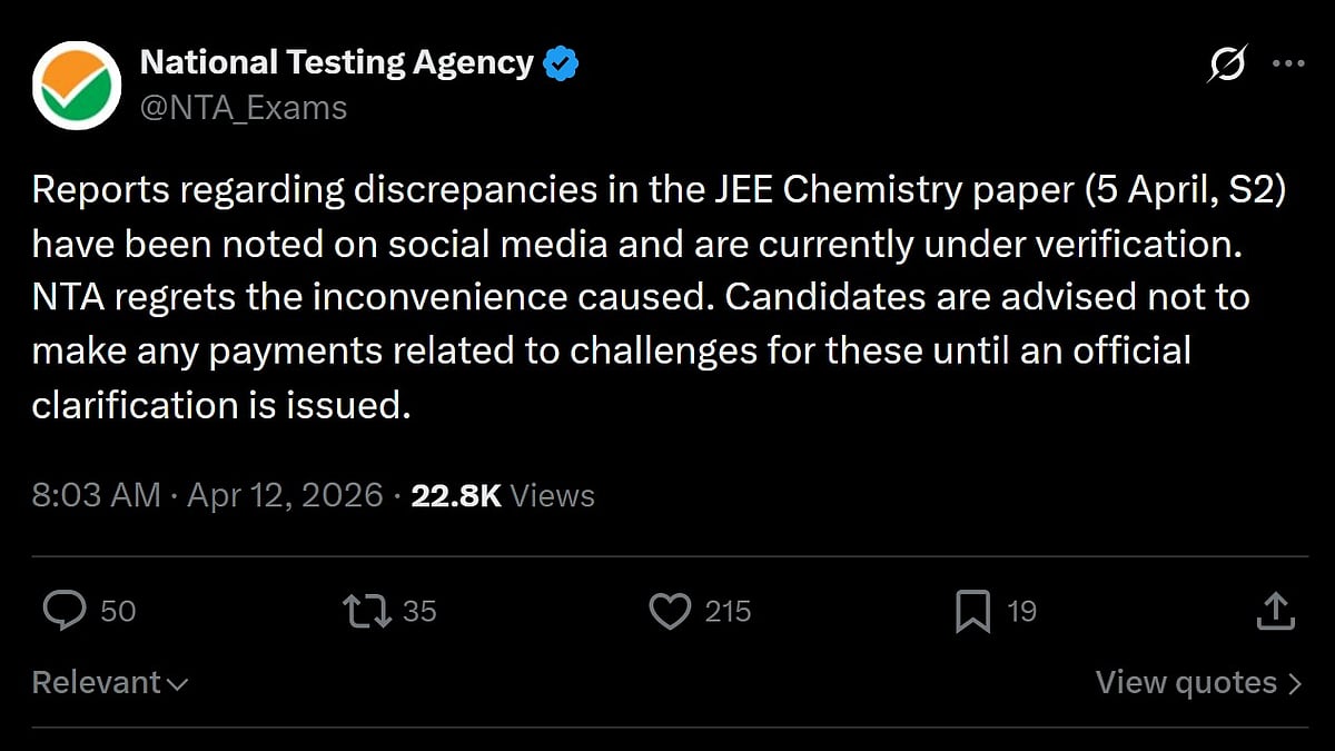 The NTA stated that, “Reports regarding discrepancies in the JEE Chemistry paper (5 April, S2) have been noted on social media and are currently under verification. NTA regrets the inconvenience caused. Candidates are advised not to make any payments related to challenges for these until an official clarification is issued”.