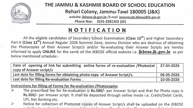 Students who wish to obtain photocopies of their answer sheets or apply for re-evaluation can submit their applications online through the official website of JKBOSE.The link for re-evaluation or photocopy of answer scripts will be open on April 27. The last date to apply for a photocopy of the answer script is May 6. The last date for filling re-evaluation forms is April 10.