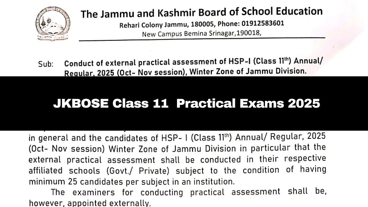 JKBOSE Class 11 Practical Exams 2025: The Jammu and Kashmir Board of School Education (JKBOSE) issued a significant circular regarding the conduct of External Practical Examinations in Higher Secondary Part-I (Class 11th) Annual/Regular 2025 Examination (Oct–Nov Session) in respect of the Winter Zone of Jammu Division.