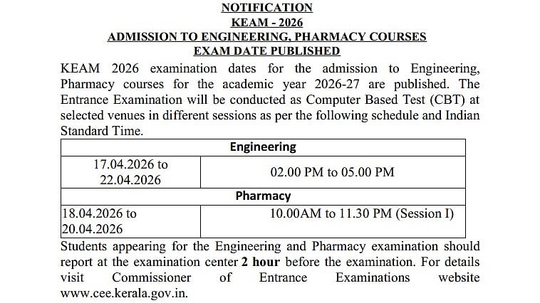 Alongside the schedule, the KEAM 2026 admit card was released on April 8. Hall tickets are available for downloading by the registered candidates at the official website of cee.kerala.gov.in using the application number and password.
