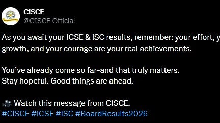 New Delhi: As lakhs of students anxiously await the ICSE and ISC Results 2026, the Council for the Indian School Certificate Examinations (CISCE) has released a video message on X, urging students not to panic and reminding them that marks do not define their future.