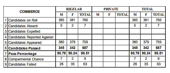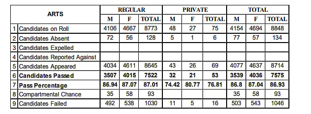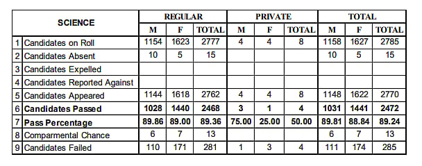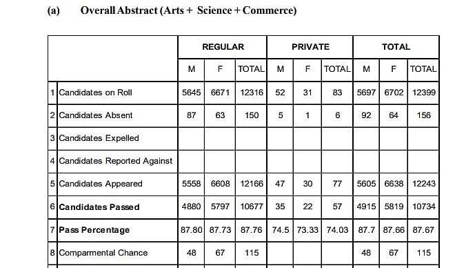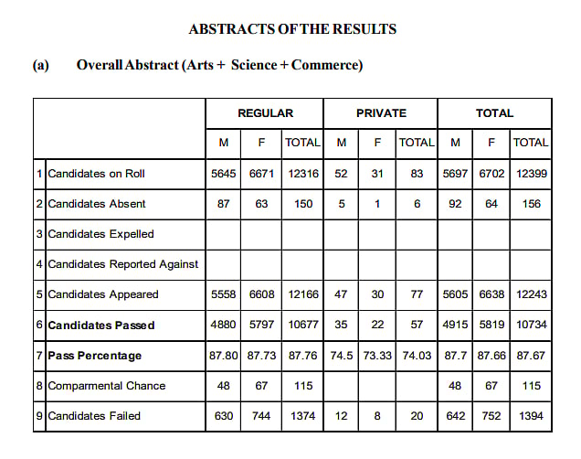 A total of 10,734 candidates passed the Higher Secondary School Leaving Certificate Examinations 2026, with 4,915 males and 5,819 females. The overall pass percentage was 87.67%, with male and female pass rates of 87.7% and 87.66%, respectively.