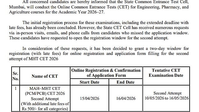 MHT CET 2026 Second Attempt Registration: The State Common Entrance Test (CET) Cell in Maharashtra will close the MHT CET 2026 second attempt registration window today on its official website, mahacet.org. Candidates who have not yet applied should complete the registration process before the deadline. The registration window for the second attempt was open from April 15 to April 16, 2026. Candidates who missed the earlier application deadline could apply with a late fee of ₹500. This opportunity is open to PCM, PCB, and Agriculture stream candidates.