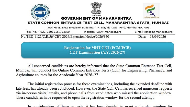 MHT CET 2026 Second Attempt Registration: The State Common Entrance Test (CET) Cell, Maharashtra, has announced a fresh opportunity for candidates who missed the initial application deadline for MHT CET 2026. In an official notice issued on April 13, the CET Cell confirmed that a special two-day registration window will be opened for the second attempt of the exam.