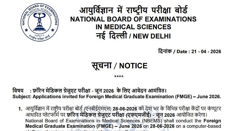 NBEMS FMGE June 2026 Registration: The National Board of Examinations in Medical Sciences has opened the application window for the Foreign Medical Graduate Examination (FMGE) June 2026 session. The entrance test, mandatory for foreign medical graduates seeking to practise in India, will be conducted on June 28 in a computer-based format across multiple centres in the country.