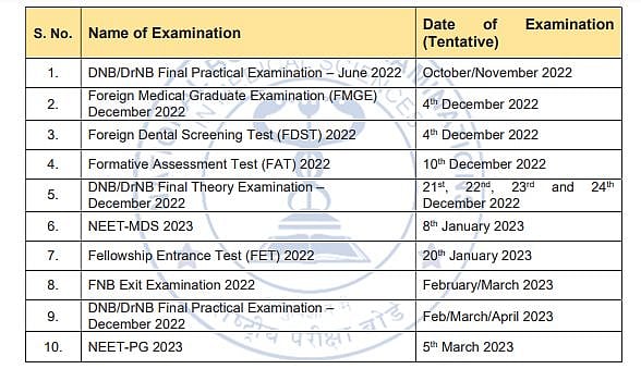 The Foreign Medical Graduate Examination (FMGE) for December 2022 and the Foreign Dental Screening Test (FDST) for December 2022 is also tentatively scheduled for December 4. The Formative Assessment Test (FAT) 2022 is set for December 10, 2022.
