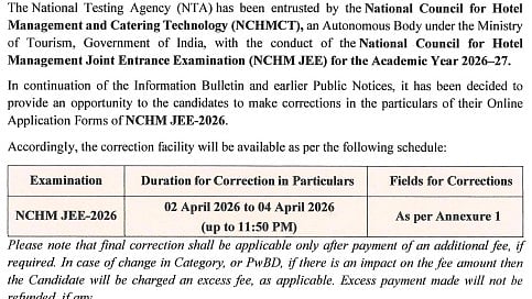 NCHM JEE 2026 Correction Window: The National Council for Hotel Management Joint Entrance Examination (NCHM JEE) 2026 will be closing the correction window tomorrow, i.e., 4 April, 2026, at 11.50 PM.