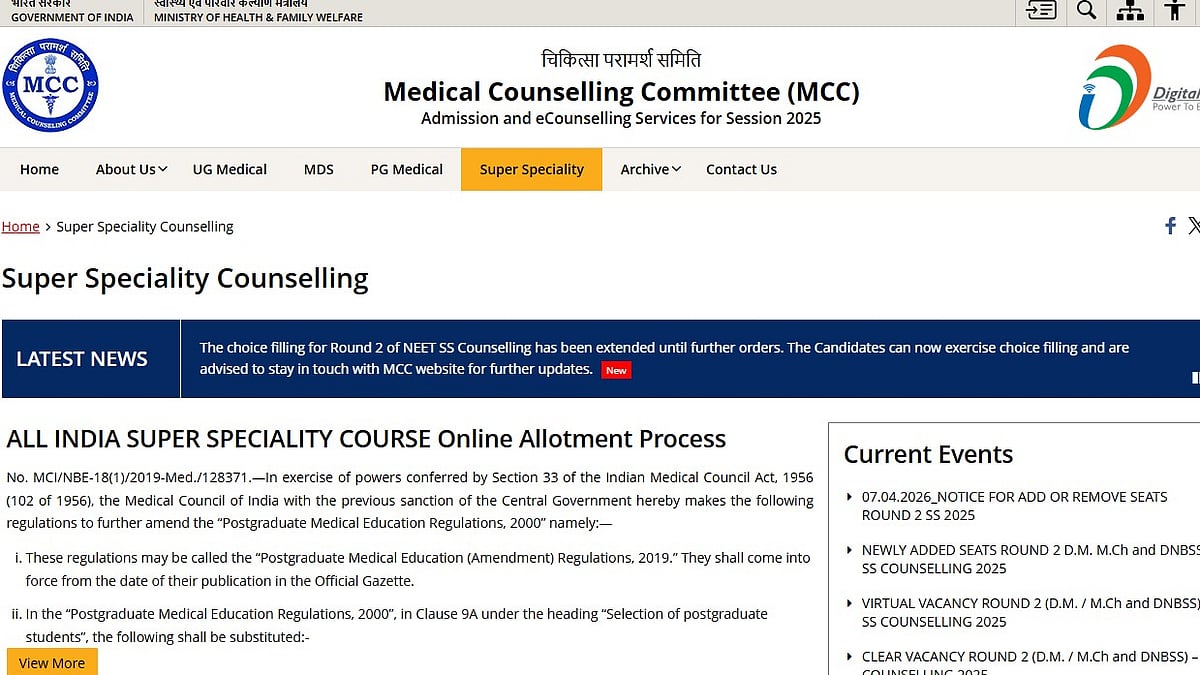 NEET SS 2025 Round 2 Counselling: The NEET SS 2025 choice-filling facility for round 2 counselling has been extended again until further notice. The official website of the Medical Counselling Committee (MCC) states that “The choice filling for Round 2 of NEET SS Counselling has been extended until further orders. The Candidates can now exercise choice filling and are advised to stay in touch with the MCC website for further updates."