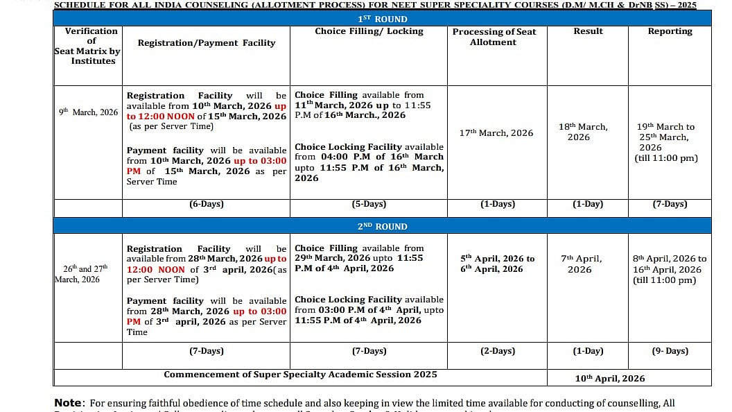 The NEET SS 2025 round 1 counselling registration will be conducted between March 10 and March 15, 2026. The choice filling for round 1 will be conducted between March 11 and 16, 2026. The NEET SS 2025 round 2 counselling registration will be conducted between March 26 and March 27, 2026. The Super Specialty Academic Session 2025 will begin on April 10, 2026