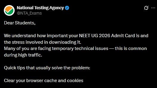 To address the concerns, the NTA posted a message on its official social media account reassuring students and acknowledging the stress of accessing admit cards. The agency noted, "We understand how important your NEET UG 2026 Admit Card is and the stress involved in downloading it. Many of you are facing temporary technical issues—this is common during high traffic”.
