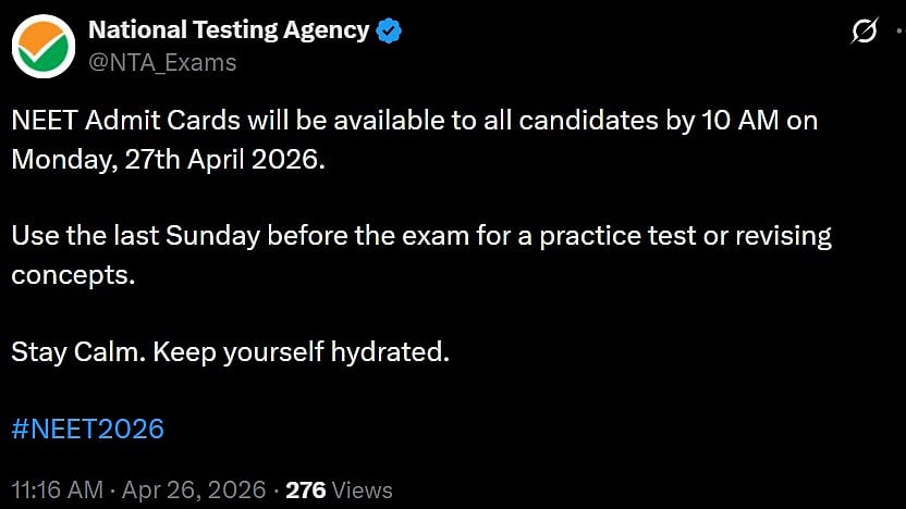 NEET UG Admit Card 2026: The National Testing Agency (NTA) informed candidates via its official social media handle that the NEET UG 2026 admit cards will be available to all registered candidates by 10 AM on Monday, April 27, 2026. In the same message, aspirants were advised to utilise the last Sunday before the examination for attempting a practice test or revising key concepts. The agency also urged students to stay calm, maintain focus, and keep themselves well-hydrated during this crucial period leading up to the exam.