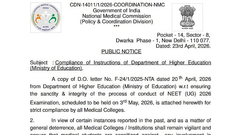 NEET UG 2026: Ahead of the National Eligibility cum Entrance Test Undergraduate (NEET UG) 2026, the government has asked medical colleges and institutions across the country not to grant leave to students on May 2 and May 3, except in exceptional cases with proper justification. NEET UG 2026 is scheduled to be held on May 3 in pen-and-paper mode.