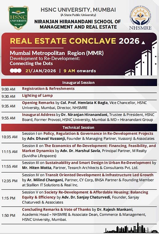 As Mumbai stands at critical crossroads of growth and renewal and enters a decisive phase of urban transformation, Niranjan Hiranandani School of Management and Real Estate (NHSMRE), HSNC University, Mumbai, will organise the third edition of its flagship Real Estate Conclave on January 21, 2026 at its Worli campus. The conclave will bring together leading voices from real estate development, policy, law, finance, architecture and academia to examine how the Mumbai Metropolitan Region is navigating the complex shift from expansion-led growth to large-scale re-development, balancing economic feasibility, sustainability, infrastructure demands and community interests.