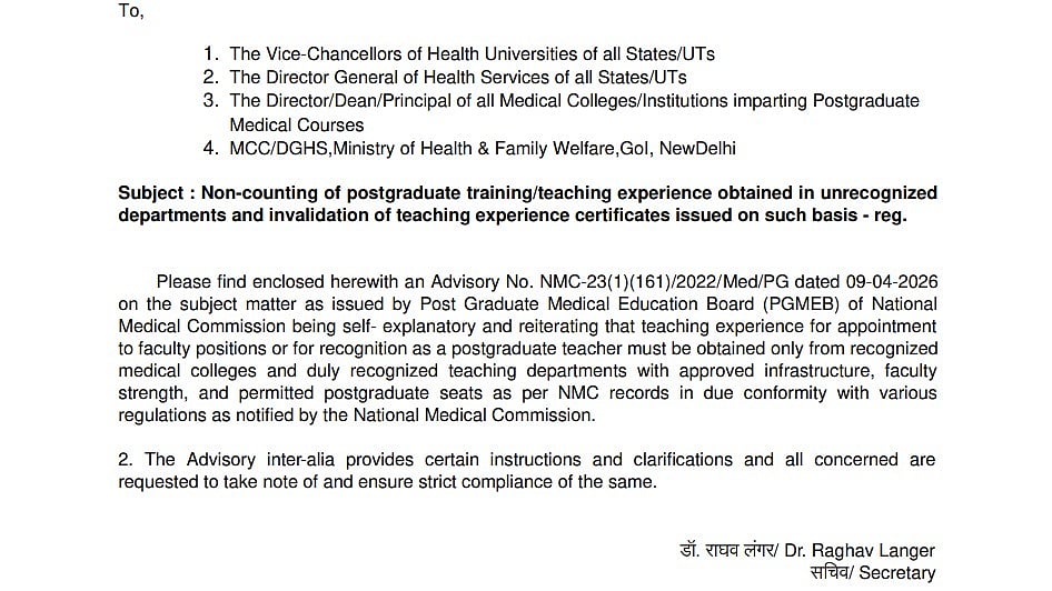 In a notice dated April 10, 2026, issued from its office in Dwarka, the NMC said it has come across instances where teaching experience certificates were being issued based on work done in departments that are not approved to conduct postgraduate medical education.