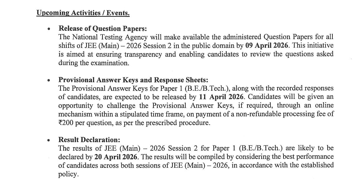 NTA JEE Main 2026 Session 2 Timeline: The National Testing Agency (NTA) has announced the key dates for the release of the answer key and results for JEE (Main) 2026 Session 2, following the successful conduct of the examination earlier this month.