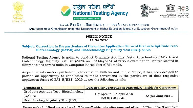 NTA GAT-B, BET 2026 Correction Window: Correction facility has been made available by the NTA for the candidates who have applied for the Graduate Aptitude Test–Biotechnology (GAT-B) and the Biotechnology Eligibility Test (BET) 2026. This is being done as an exceptional measure to enable candidates to rectify mistakes in their application form.