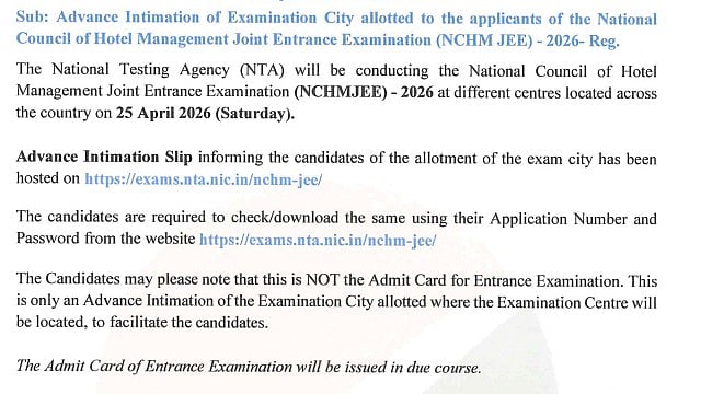 NCHM JEE 2026 City Slip Released: The National Testing Agency has released the city notification slip for NCHM JEE 2026. Candidates who have registered for the National Council for Hotel Management Joint Entrance Examination (NCHM JEE) can now view their exam city by logging into the official portal.