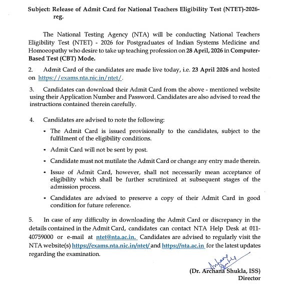 NTET Admit Card 2026 Out: Contact Details for Assistance