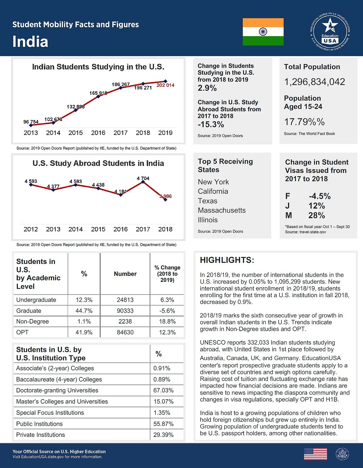 Per the report, Indians make up over 18 percent of all international students in the United States. India provided the second highest number of graduate students and jumped up to third place in undergraduates.