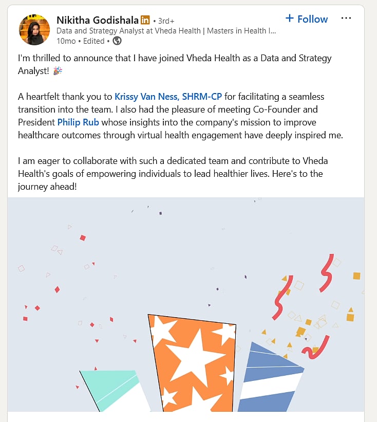 Her contribution did not go unnoticed by the management of the company. Shameet Luhar, CEO, Board Member and Co-Founder of Vheda Health, publicly praised her work, writing, “Nikitha, we are proud of your contributions to Vheda and humbled you have chosen us as your home. When the team is ‘All-In’, our members and industry all move forward, together.”