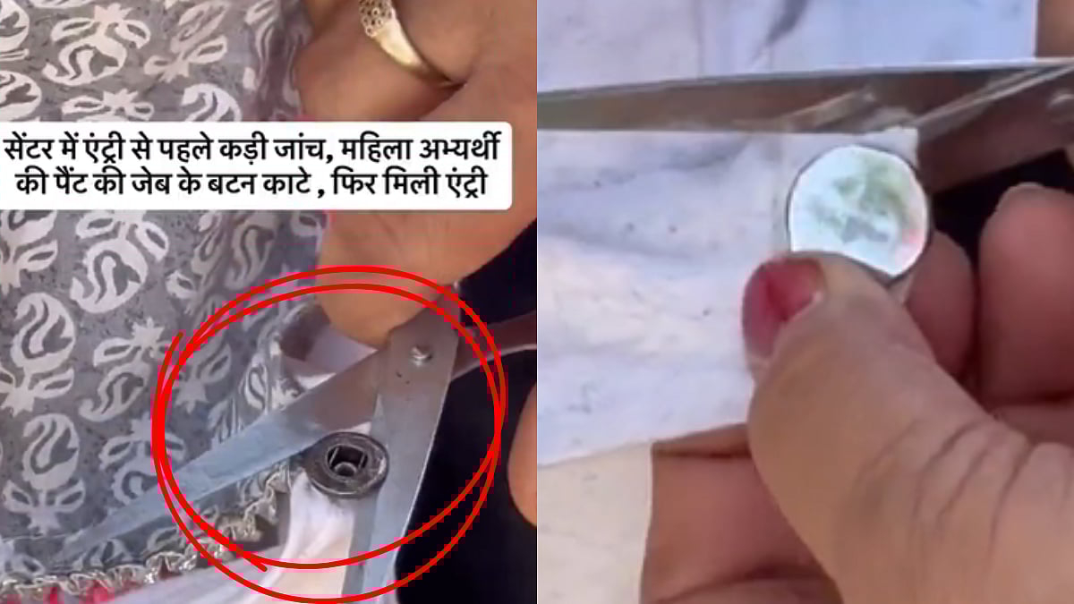 In the viral video, a female candidate is stopped at the entry gate after it is noticed that her trousers have metal buttons on the pockets. One women staff member is seen removing the buttons using scissors before allowing her inside.