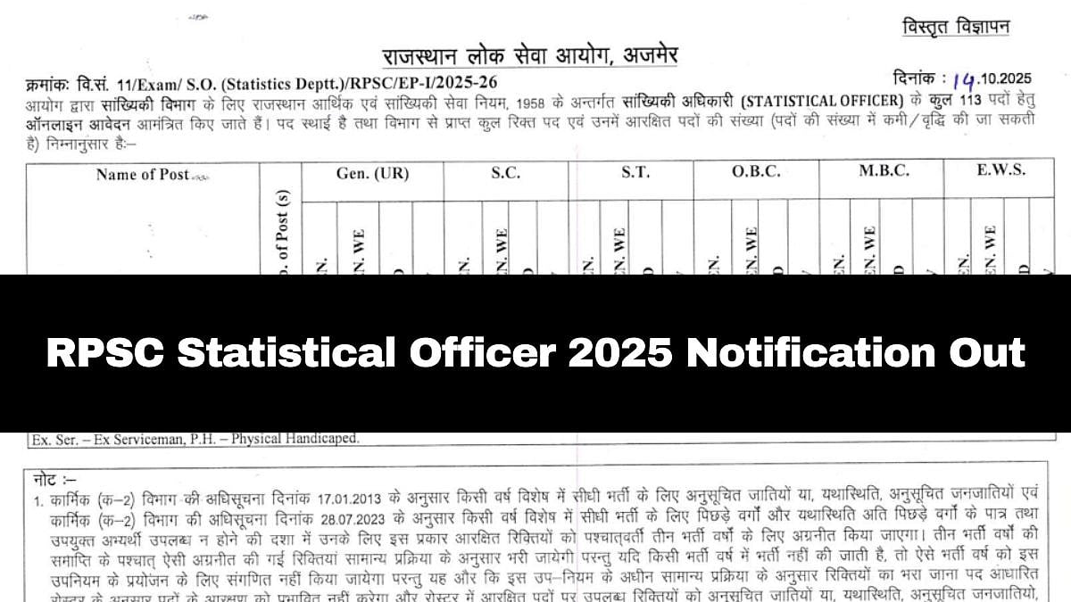 RPSC Statistical Officer Recruitment 2025: The Rajasthan Public Service Commission (RPSC) will begin accepting applications for the Statistical Officer positions on October 28, 2025. Aspirants can complete their forms on the RPSC's official website, rpsc.rajasthan.gov.in. Qualified candidates will be allowed to apply online until November 26, 2025. This recruitment campaign will fill 113 jobs.