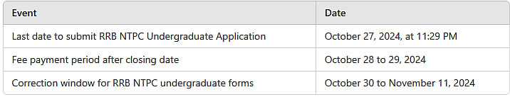 The final date to complete the RRB NTPC application for undergraduate posts is October 27, 2024, by 11:29 PM. Previously, the deadline was October 20. Candidates can make their application fee payments from October 28 to 29. The application correction window will be open from October 30 to November 11, 2024.