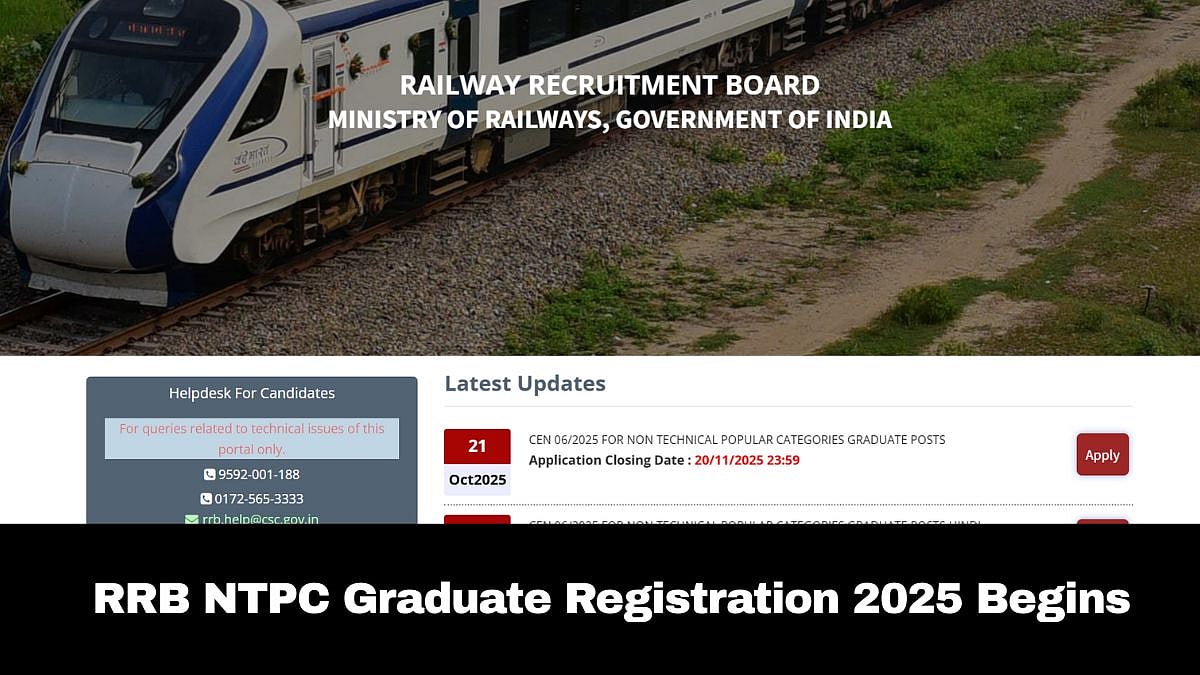 RRB NTPC Graduate Registration 2025: The Railway Recruitment Board (RRB) has invited eligible applicants to apply online for different Non-Technical Popular Categories (Graduate) jobs under Advt. No. 06/2025. Qualified applicants can submit applications for the positions via the official website of RRB at rrbcdg.gov.in until November 20, 2025.