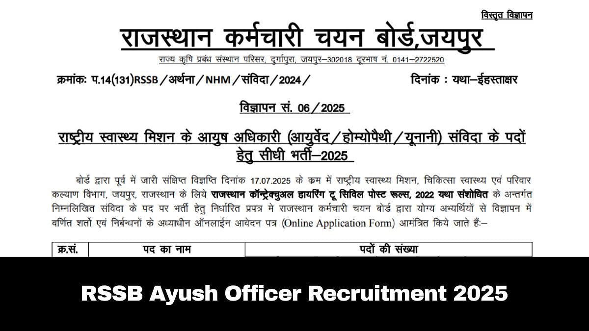RSSB Ayush Officer Recruitment 2025: The Rajasthan Staff Selection Board (RSSB) has begun accepting applications for Contractual Ayush Officer (Ayurved/Homoeopathy/Unani) positions at NHM 2025. Qualified applicants may apply for the positions through the official website rssb.rajasthan.gov.in or recruitment.rajasthan.gov.in until November 8, 2025. The recruitment effort intends to fill 1535 posts.