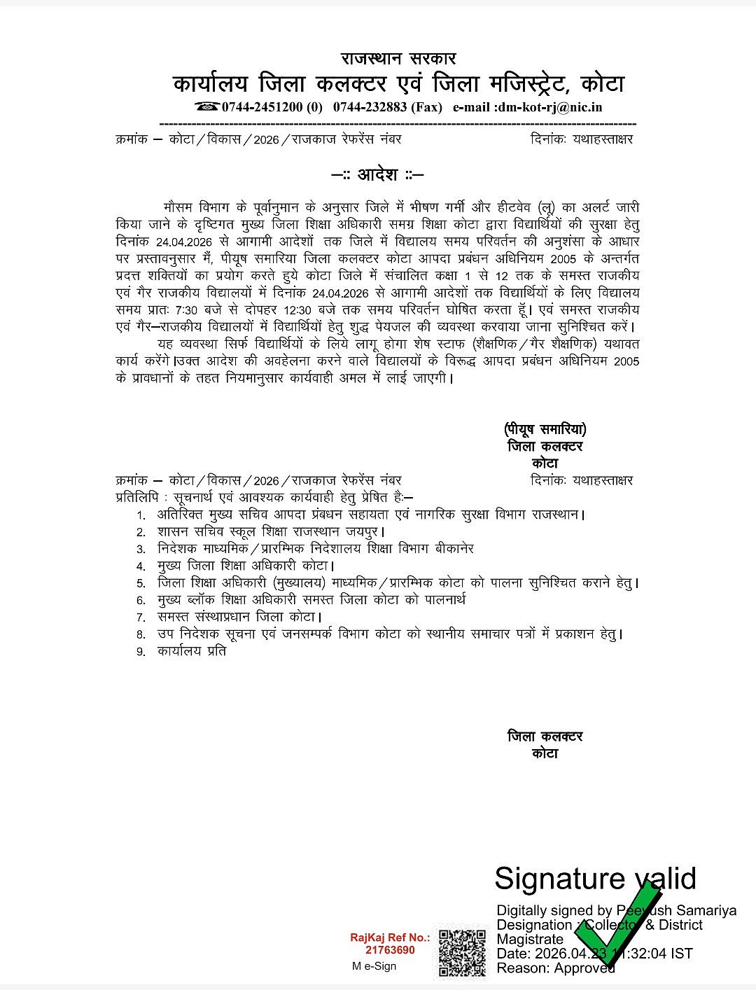 Due to the extreme heat, District Collector Shri Piyush Samaria has issued an order that, starting on April 24 and continuing until further notice, students in Classes 1 through 12 attending the district's government and private schools will attend classes from 7:30 AM to 12:30 PM.