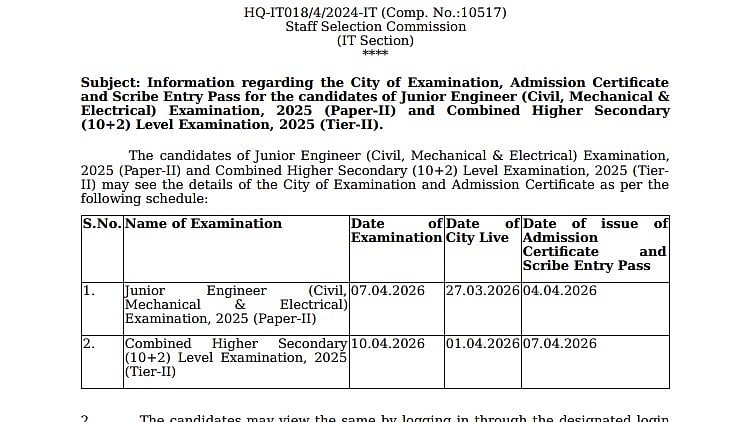 SSC 2026: On its official website, ssc.gov.in, the Staff Selection Commission (SSC) has released the dates for the publication of the city notification slip, admission cards, and scribe facilities for the Junior Engineer (JE) 2025 Paper 2 and Combined Higher Secondary Level (CHSL) 10+2 Tier 2 exams. The commission has also announced the final answer keys and grades for JE Paper-I.