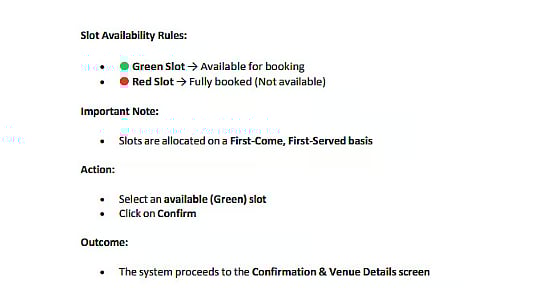 Candidates need to select their preferred venue, date, and time slot online.