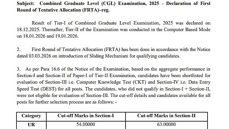 SSC CGL 2026 Result Released: The Staff Selection Commission (SSC) has declared the First Round of Tentative Allocation (FRTA) for the Combined Graduate Level (CGL) Examination 2025 on the official website at ssc.gov.in.