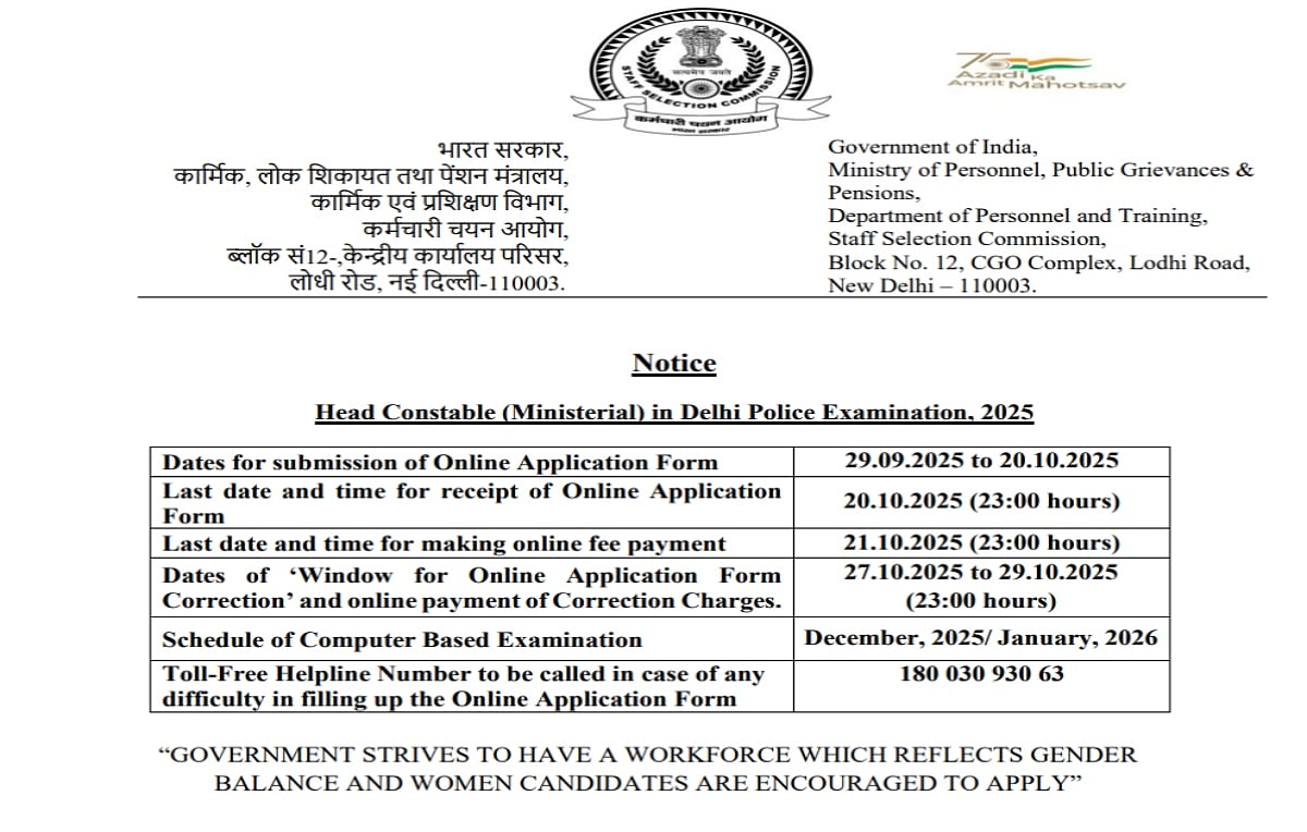 SSC Delhi Police Head Constable Recruitment 2025: The registration process for the Head Constable (Ministerial) in the Delhi Police Examination 2025 ends today, October 20, 2025, by the Staff Selection Commission (SSC). Applicants can still apply for the positions on the official website of SSC at ssc.gov.in.