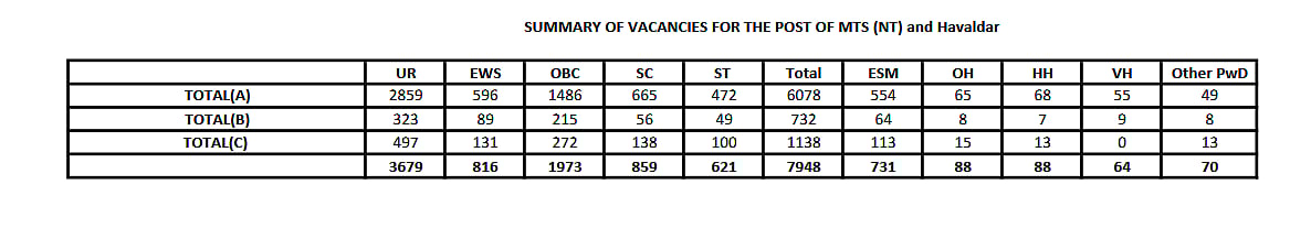 In all, there are 6810 openings for MTS, divided into two categories: 18-27 years and 18-25 years old. The exact number for these two categories is not available as of now, but it will be incorporated in the final notification. Additionally, 1,138 openings are to be filled by Havaldar under the CBIC & CBN cadre.