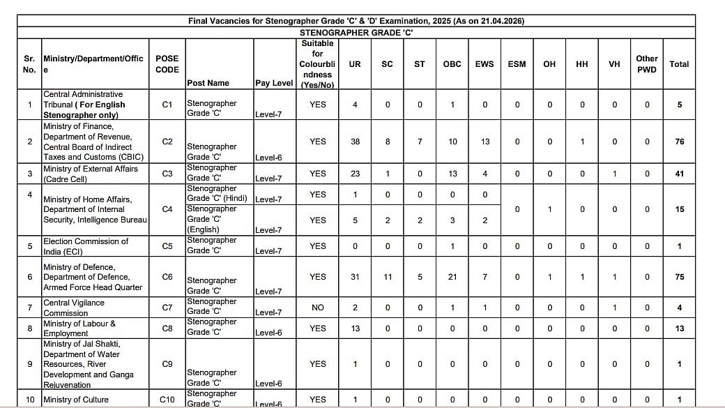 SSC Stenographer 2026: The Staff Selection Commission (SSC) has released the final vacancies list for the SSC Stenographer Grade ‘C’ and Grade ‘D’ examinations 2026 on the official website. Candidates who have appeared for the exam can now access the vacancy details on the official website, the SSC official website.