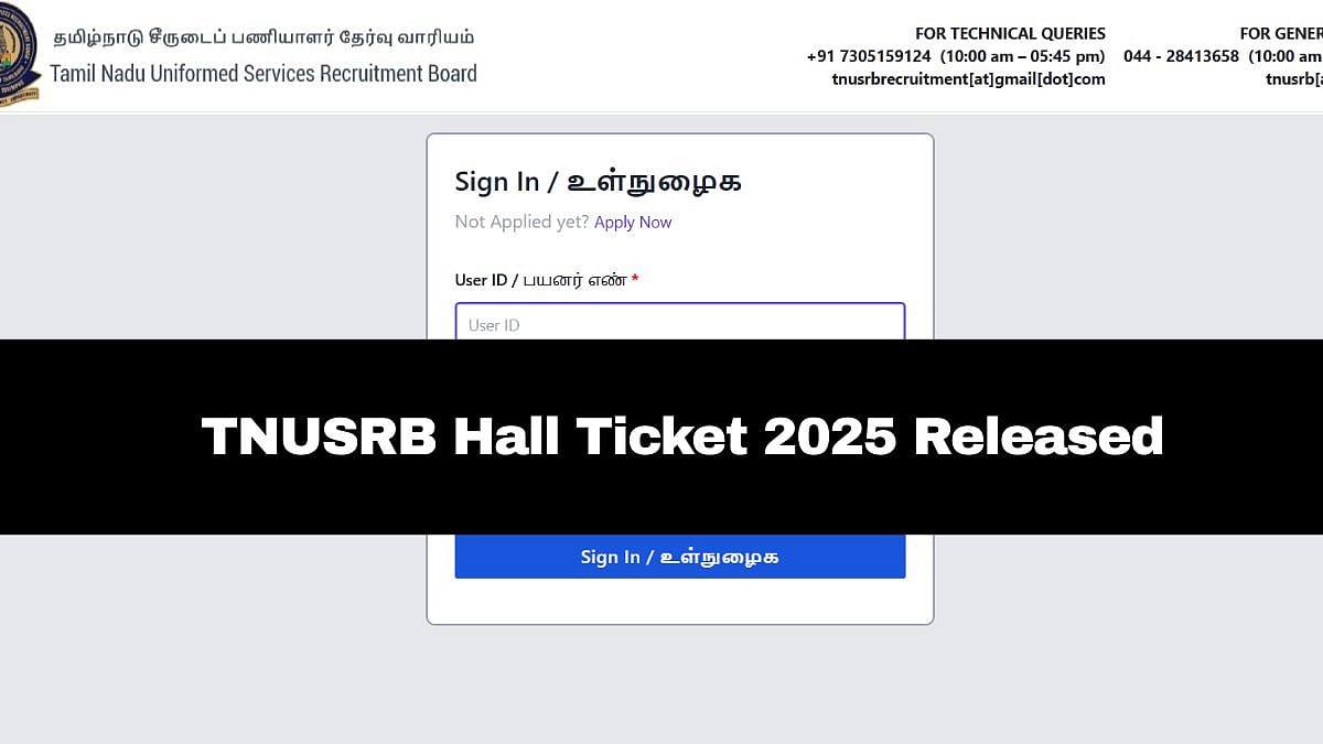 TNUSRB Hall Ticket 2025: Tamil Nadu Uniformed Services Recruitment Board (TNUSRB) has issued the TNUSRB Hall Ticket 2025 for Police Constables, Jail Warders, and Firemen positions. Applicants who wish to sign up for the examination can obtain their admit cards via the TNUSRB's official website at tnusrb.tn.gov.in. The written test will be conducted on November 9, 2025.